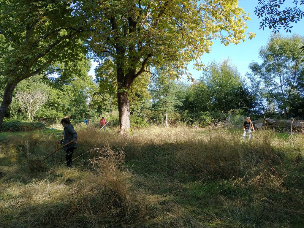 Our morning was spent around the main roundhouse area, doing various tasks and enjoying the late summer sunshine. We scythed the last of the long meadow. A new path was reclaimed through the bramble, allowing visitors to visit one of our Caucasian limes. Meanwhile a group of volunteers did an amazing job, sawing and splitting firewood.